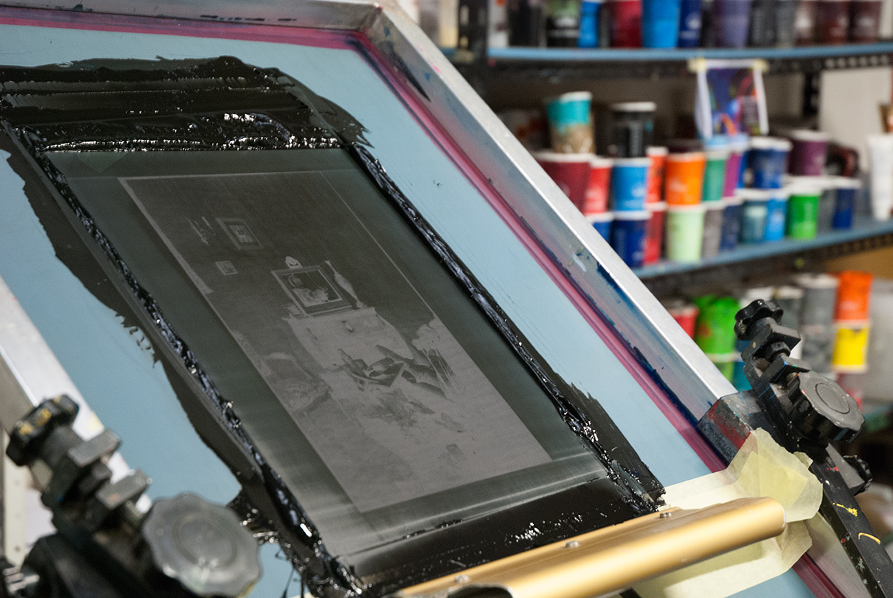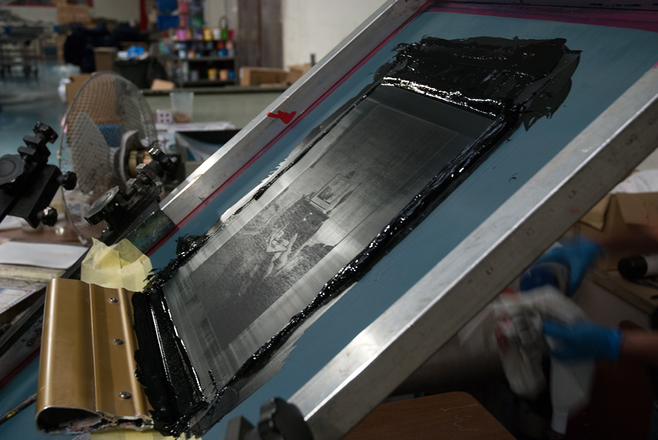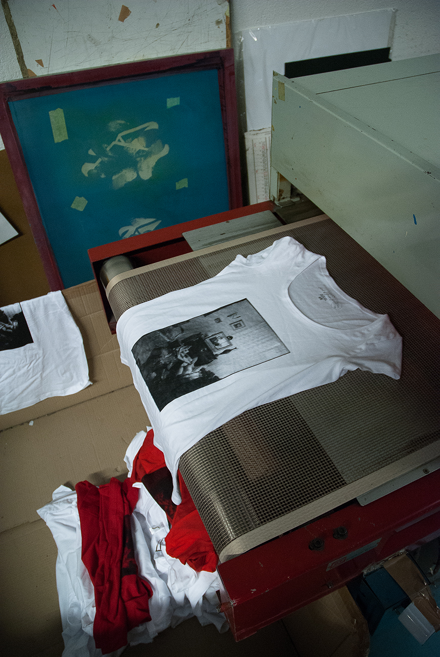 Ce fut suite à une gentille proposition qu’a été sérigraphiée sur T-shirt la photographie Télé Pan ! Affairés dans un hangar de la banlieue industrielle Lyonnaise, par une belle après midi de printemps, dans la plus pure tradition DIY chère à mon coeur, nous avons noirci le tissus blanc à grands coups de raclettes.