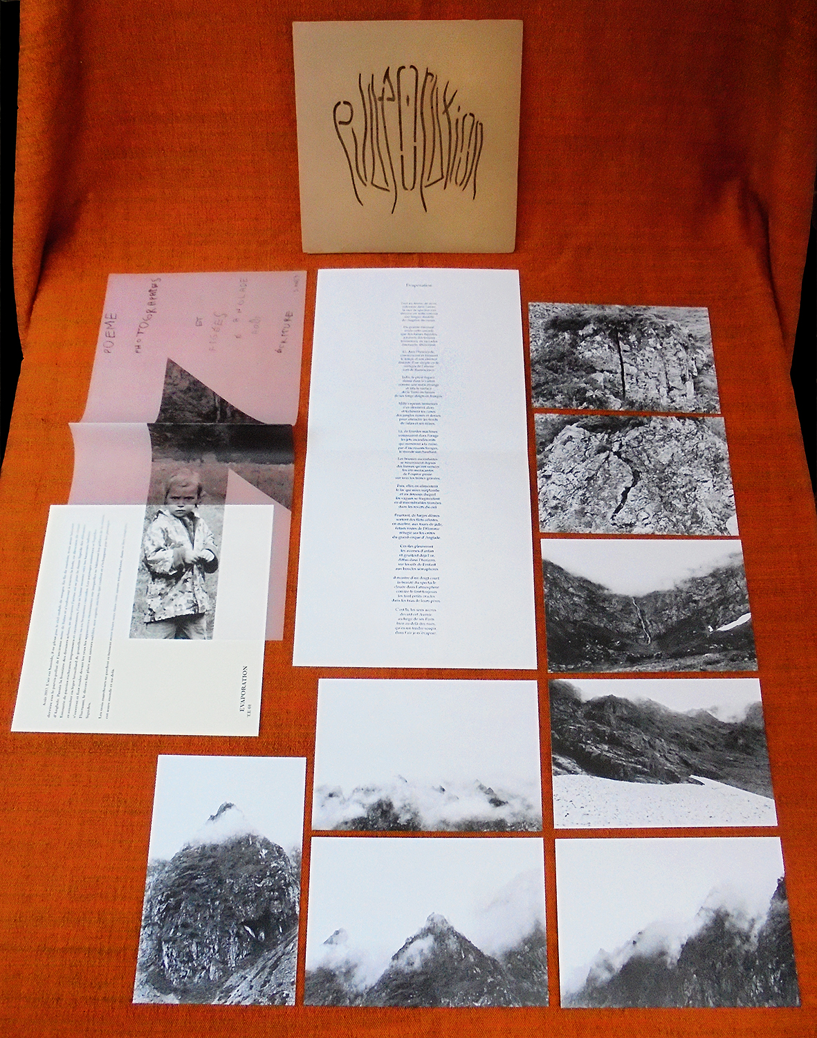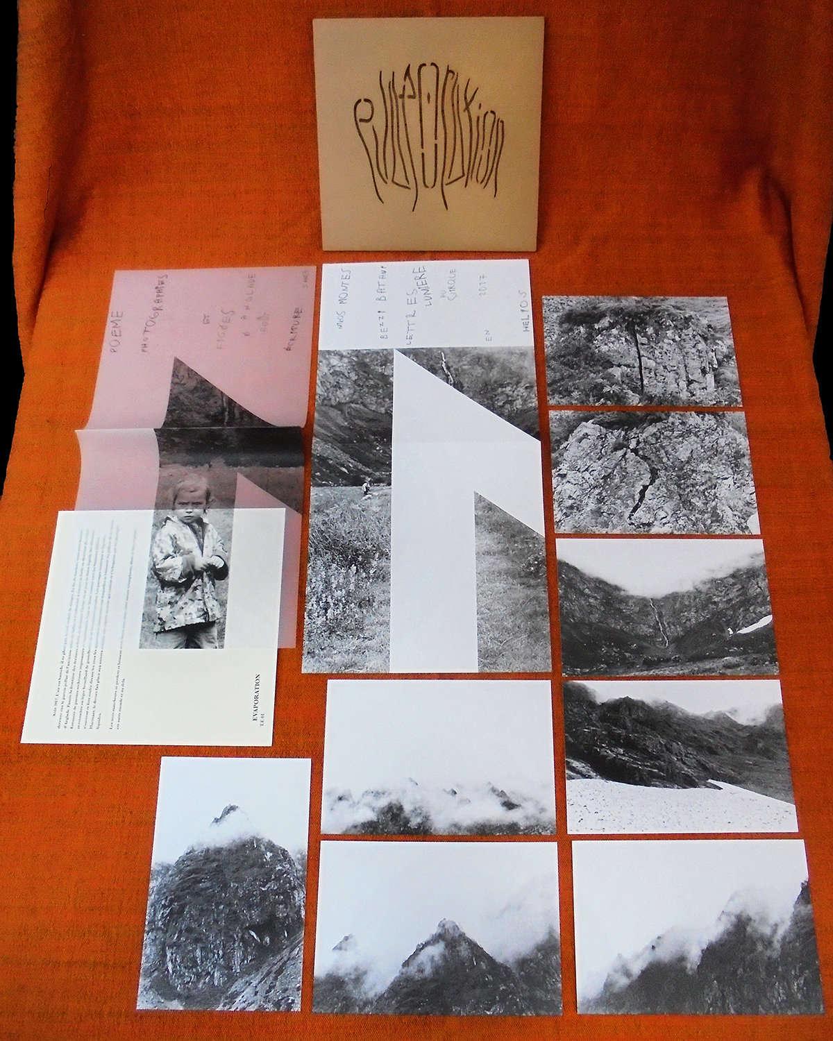 Ouvrage, livre objet, recueil de 9 reproductions photographiques et 1 poème issus d’une journée d’errance dans le cirque d’Anglade en Ariège. Photographies argentiques originales par Simon Bezzi Batani, poésie par Nicolas Montès. Conception, mise en page, création titre et pochette par Simon Bezzi Batani.